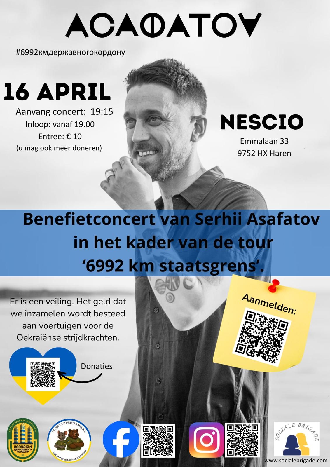 Op 16 april organiseert de Sociale Brigade in het Nescio hotel een benefietconcert van Serhii Asafatov, in het kader van zijn tour "6992 kilometer staatsgrens".