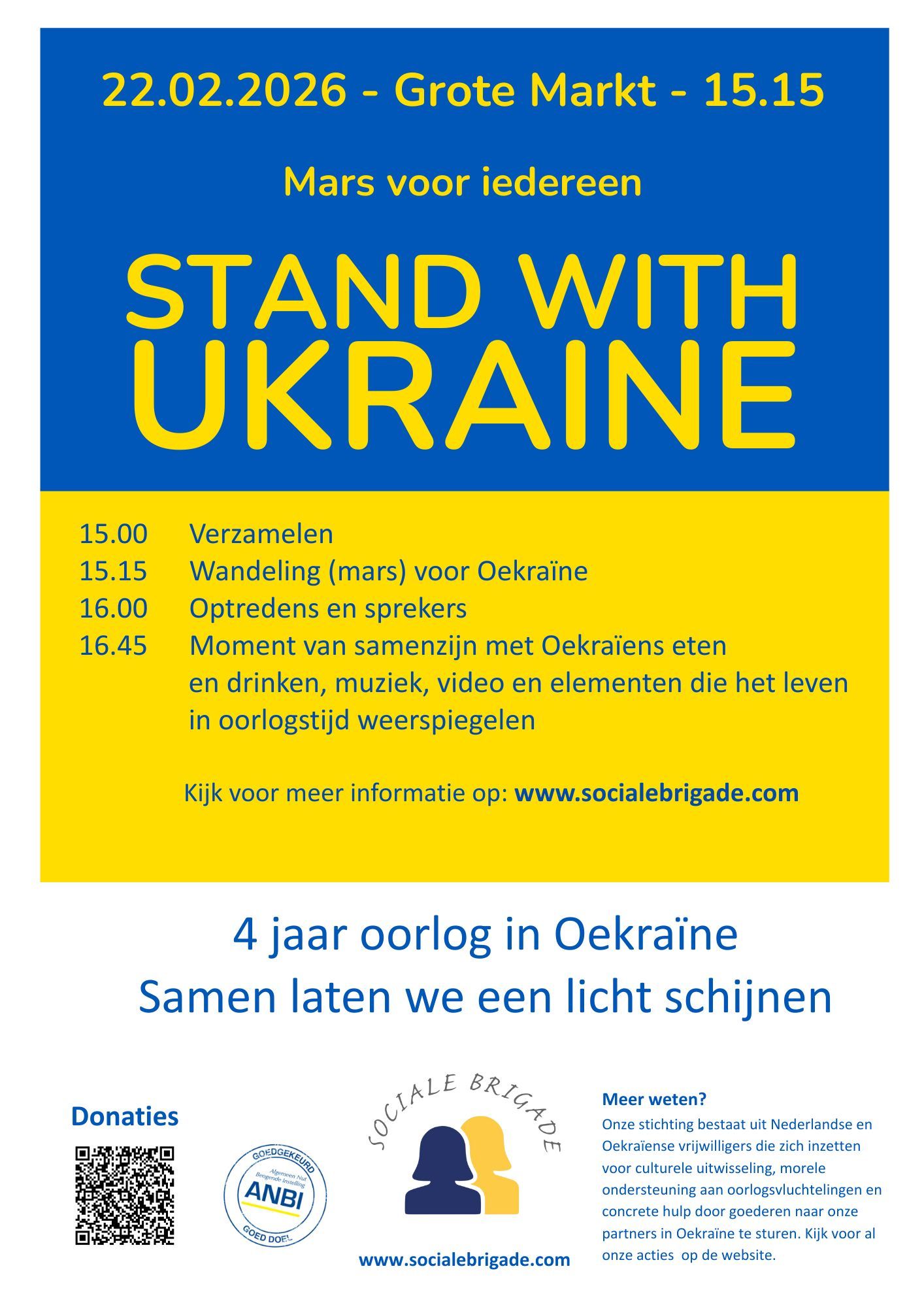 De Sociale Brigade organiseert op 22 februari 2026 een mars voor iedereen om stil te staan bij de oorlog. Het programma begint om 15:15 uur.