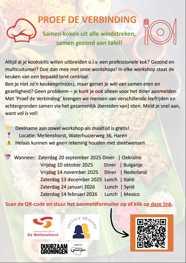 Deelname aan zowel workshop als maaltijd is gratis! Locatie: Mellenshorst, Waterhuizerweg 36, Haren